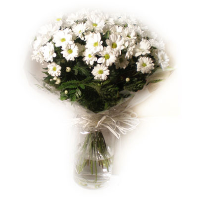 Descripcion: Ramo de margaritas y helecho cuero. Precio final (Impuestos y gastos de envio en la ciudad de Cartagena y Periferia incluidos en el precio). Se lo podemos entregar hoy o el dia que usted elija. Si desea que lo enviemos a cualquier otro lugar de la provincia de Murcia, consultenos por telefono el coste de dicho envio