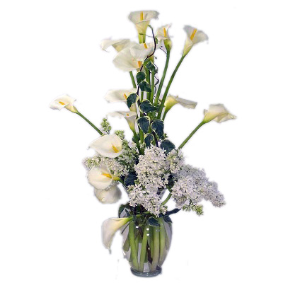 Descripcion: Arreglo floral de calas, hereda variegata y lilas, en base de cristal transparente. Precio final (Impuestos y gastos de envio en la ciudad de Cartagena y Periferia incluidos en el precio). Se lo podemos entregar hoy o el dia que usted elija. Si desea que lo enviemos a cualquier otro lugar de la provincia de Murcia, consultenos por telefono el coste de dicho envio