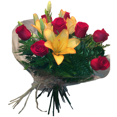 Descripcion: Ramo elaborado con rosas, lilum y verdes variados. Precio final (Impuestos y gastos de envio en la ciudad de Cartagena y Periferia incluidos en el precio). Se lo podemos entregar hoy o el dia que usted elija. Si desea que lo enviemos a cualquier otro lugar de la provincia de Murcia, consultenos por telefono el coste de dicho envio